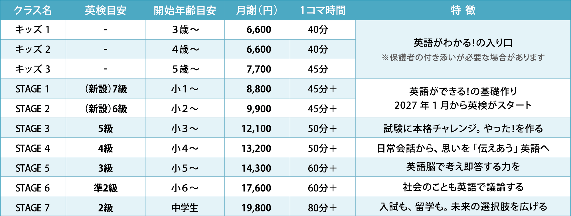 開講曜日: 月・火・木・金・土(クラスごとの詳しい時間割は、お子さまのレベルに合わせてご案内します) 授業回数: 週1回