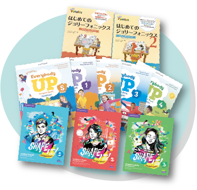 デジタル教材「Jolly Classroom」を使用し、歌やアクション、物語を通して、英語の「音」と「文字」の関係を五感(多感覚)で楽しく学びます。